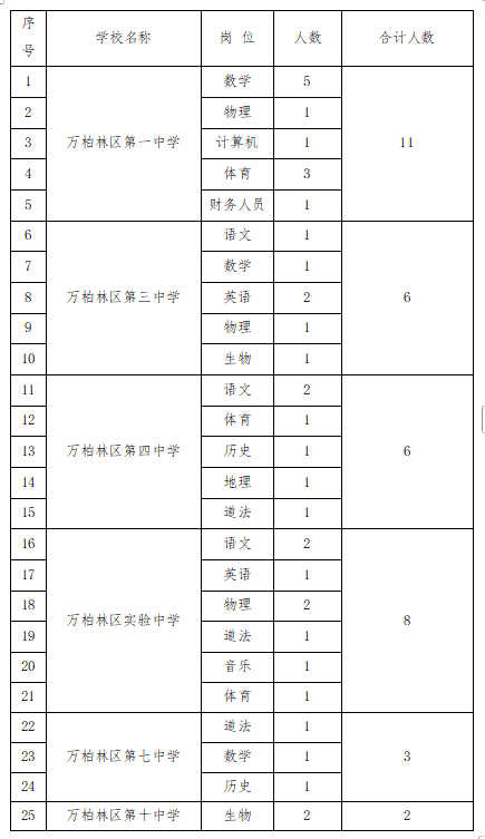 因萬柏林區第一中學、萬柏林區第三中學、萬柏林區第四中學、萬柏林區實驗中學、萬柏林區第七中學、萬柏林區第十中學有教師辭職,為滿足我區部分中學校教學需要,結合學校實際,現面向社會為以上學校補充招聘政府購買服務教師,具體公告如下: