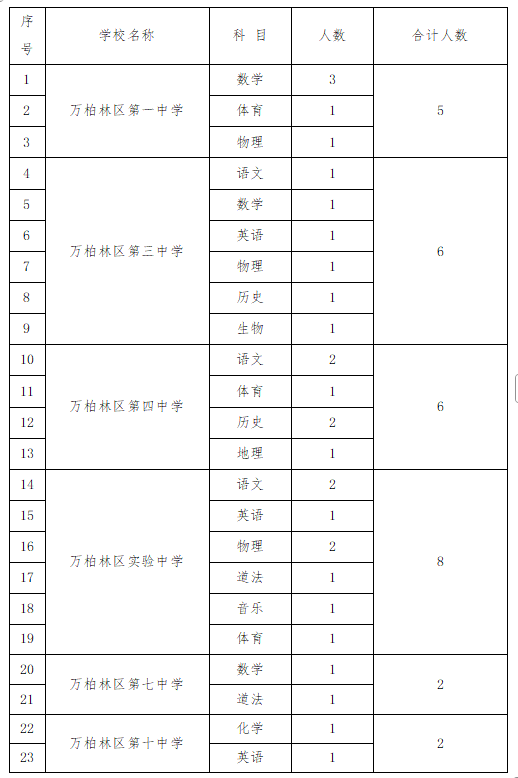 因萬柏林區第一中學、萬柏林區第三中學、萬柏林區第四中學、萬柏林區實驗中學、萬柏林區第七中學、萬柏林區第十中學教師未招滿,為滿足我區部分中學校教學需要,結合學校實際,現面向社會為以上學校補充招聘政府購買服務教師,具體公告如下: