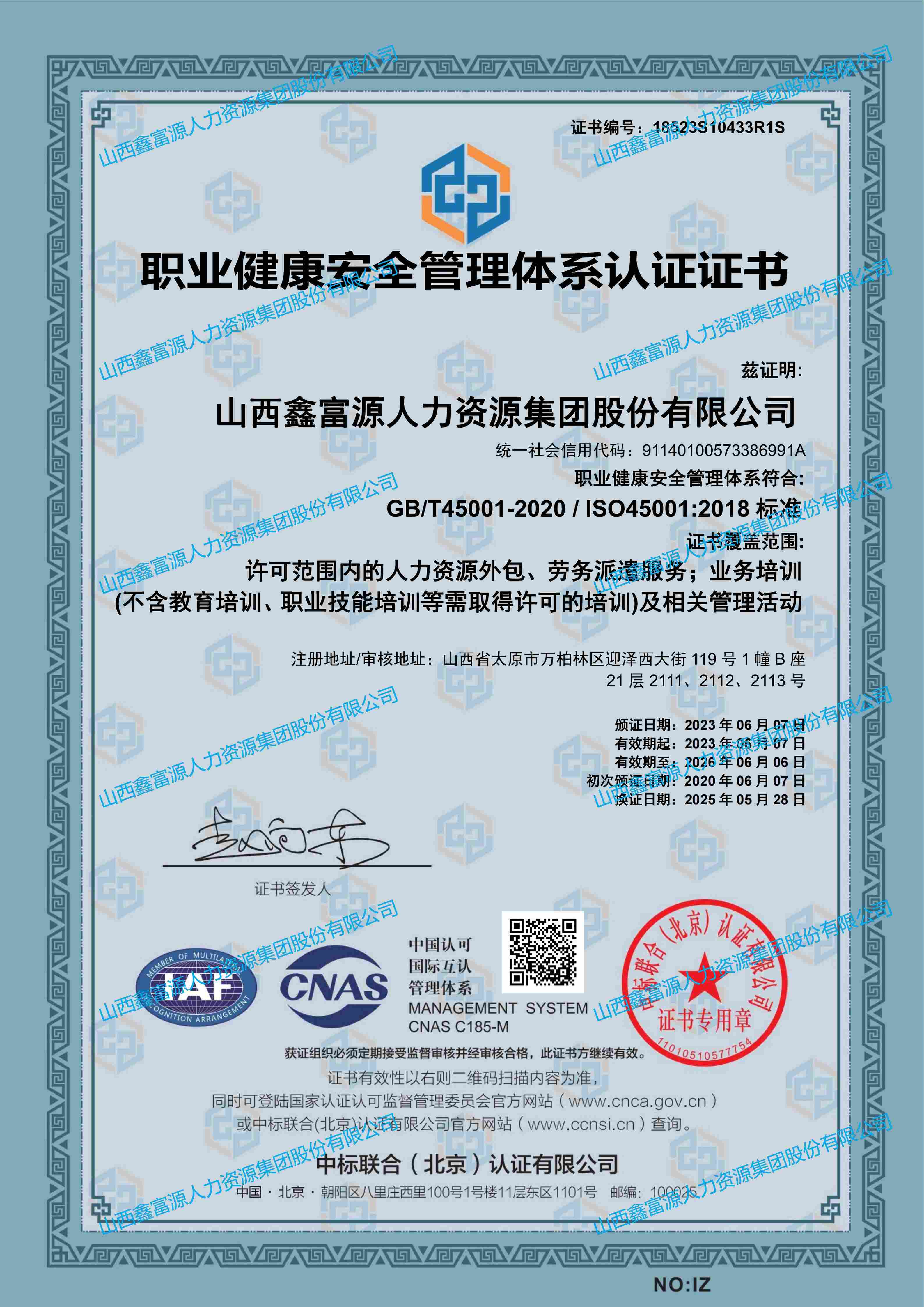 職業健康安全管理體系認證證書